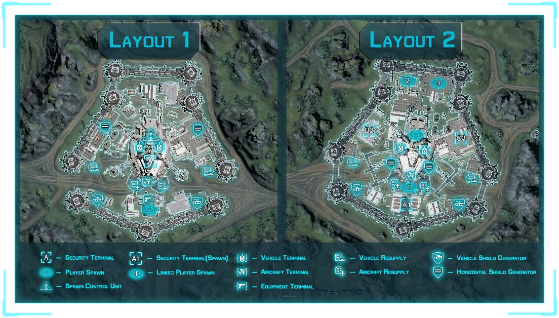The Repositories are always located in the same places, two in the places where directional shield generators would be in the case of Type 1 Station and one in the back of the facility on the second floor of the left building. The Alpha Conduit is always located inside the Main building on the walkway, in the place of the typical A point. The B Conduit is located in one of two places, either in the underground back room (in case of Type 1 Station the S.C.U room) of the main building, or inside the fortified "spawn room" style building, with the actual spawn room being then located in the other place. If the conduit is located in the seperate building, it will be protected by a shield generator located in a nearby building, if it is located in the back room, it will be available once the base is half captured, meaning that currently 6 strikes have to be scored for it to become avaiable. The Conduit in the separate building does not require breaching the Main Building first, only overloading a single generator, making this type of facility slightly more vulnerable, yet easier to take back, as repairing the generator will instantly lock the atackers out from the building (currently unknown if atackers already inside can capture more conduits and then exit the building) for at least 90 seconds.