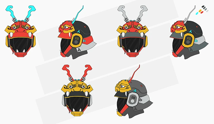 The intricacies of traditions around the holiday are diverse, so we focused on the largest groups finding the most common element that overlaps. In this case, the Dragon zodiac symbol and the colors used during the festivities such as Gold (Yellow) and Silver (White). This is our foundation behind the helmet, decal, banner, frame, and nudge ideation. The work on the helmet starts with focusing on the keywords: Dragon, Fire, Asia, Red, Yellow, PlanetSide2, Sci-Fi.